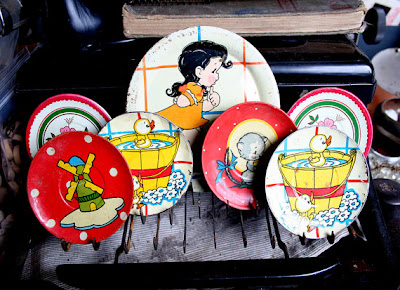 Before I go, I wanted to add my own little Upcycle-It Tip for all you fun kitschy doll-loving one-of-a-kind [OOAK] type folks out there. When I saw that Florence & Ruby Vintage was using small demitasse saucers as coasters (a brilliant idea actually), I took it one step farther and offer up this sweet little twist.
